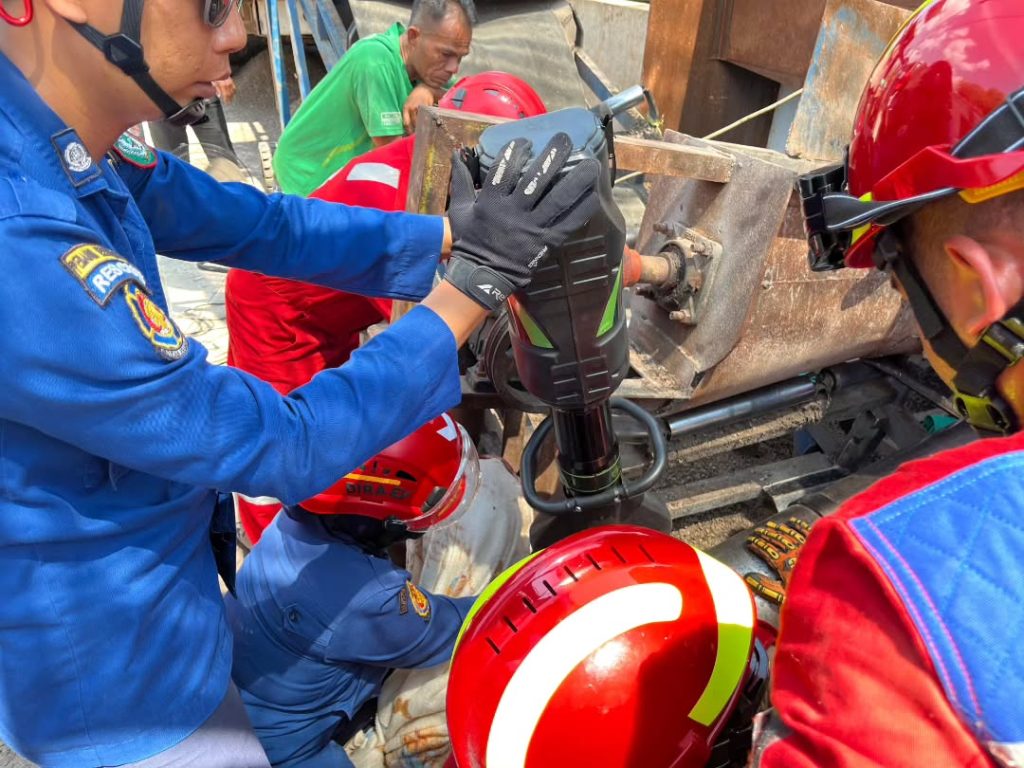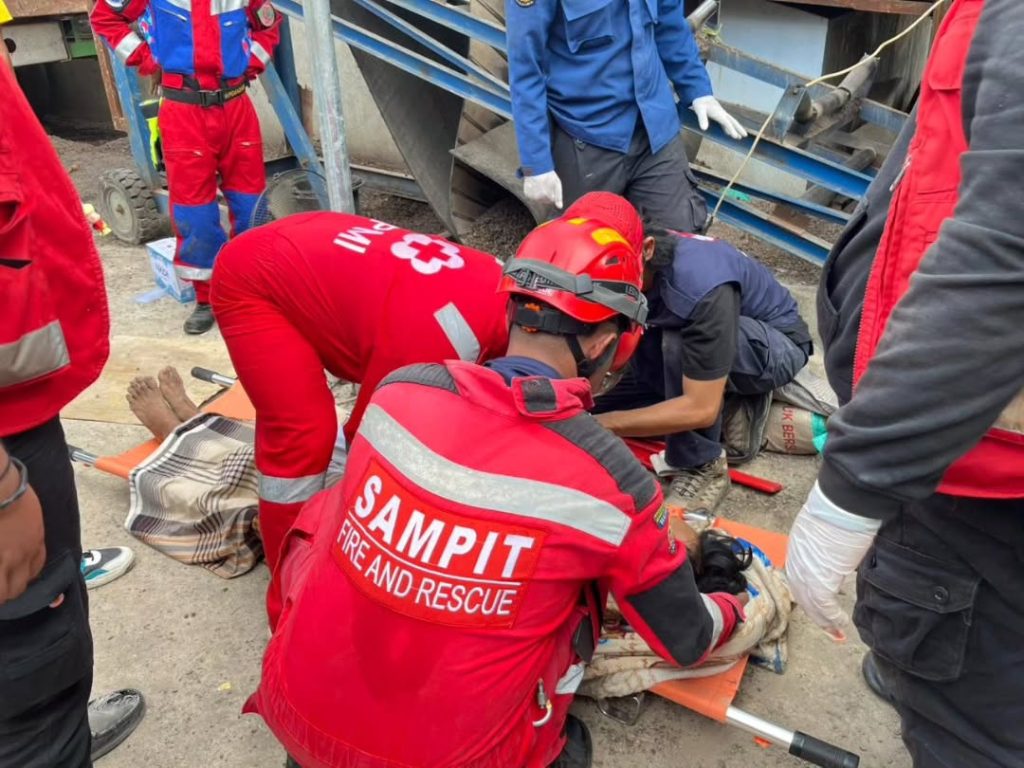Kecelakaan tersebut menimpa seorang pekerja yang tangannya terjepit mesin conveyor saat melakukan aktivitas di area kerja. Menerima laporan kejadian, petugas regu penyelamatan segera menuju lokasi dengan membawa peralatan evakuasi.